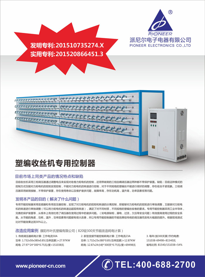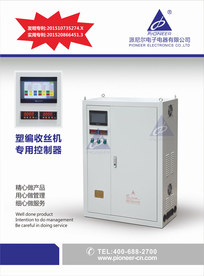 派尼爾全新研發(fā)的塑編收絲機(jī)專(zhuān)用控制器,為收絲機(jī)提供可調(diào)節(jié)電源。專(zhuān)用節(jié)能控制器采樣變頻器和專(zhuān)用變壓器控制,實(shí)現(xiàn)對(duì)力矩電機(jī)的扭矩和轉(zhuǎn)速分離控制,即能對(duì)扭矩電機(jī)的扭矩力單獨(dú)控制,又能對(duì)力矩電機(jī)的轉(zhuǎn)速單獨(dú)調(diào)整,滿(mǎn)足不同材質(zhì),不同規(guī)格的塑編絲收卷的要求。